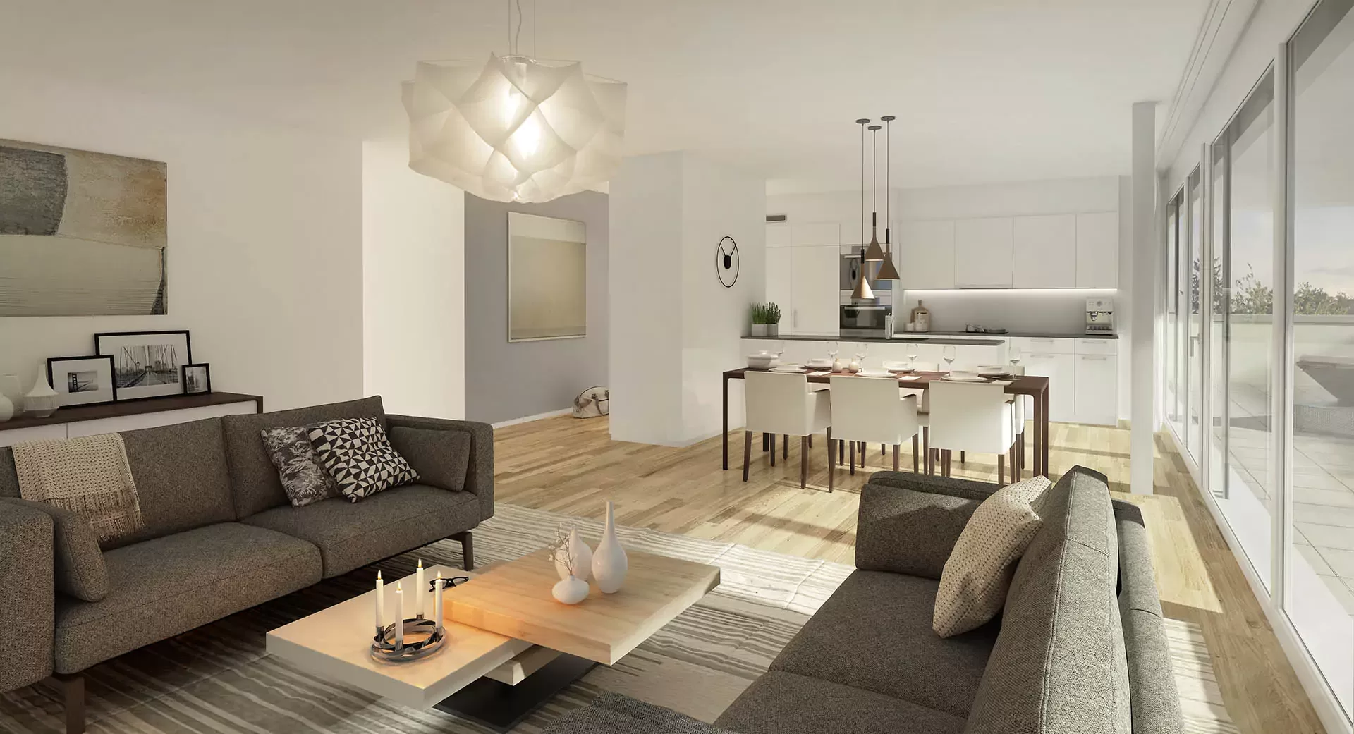 The solidly constructed buildings have an aesthetic compact façade and efficient external thermal insulation. Particular attention was paid to the generous glass panes, which are fitted into high-quality plastic window frames and boast triple insulating glazing to ensure maximum living comfort and energy efficiency.