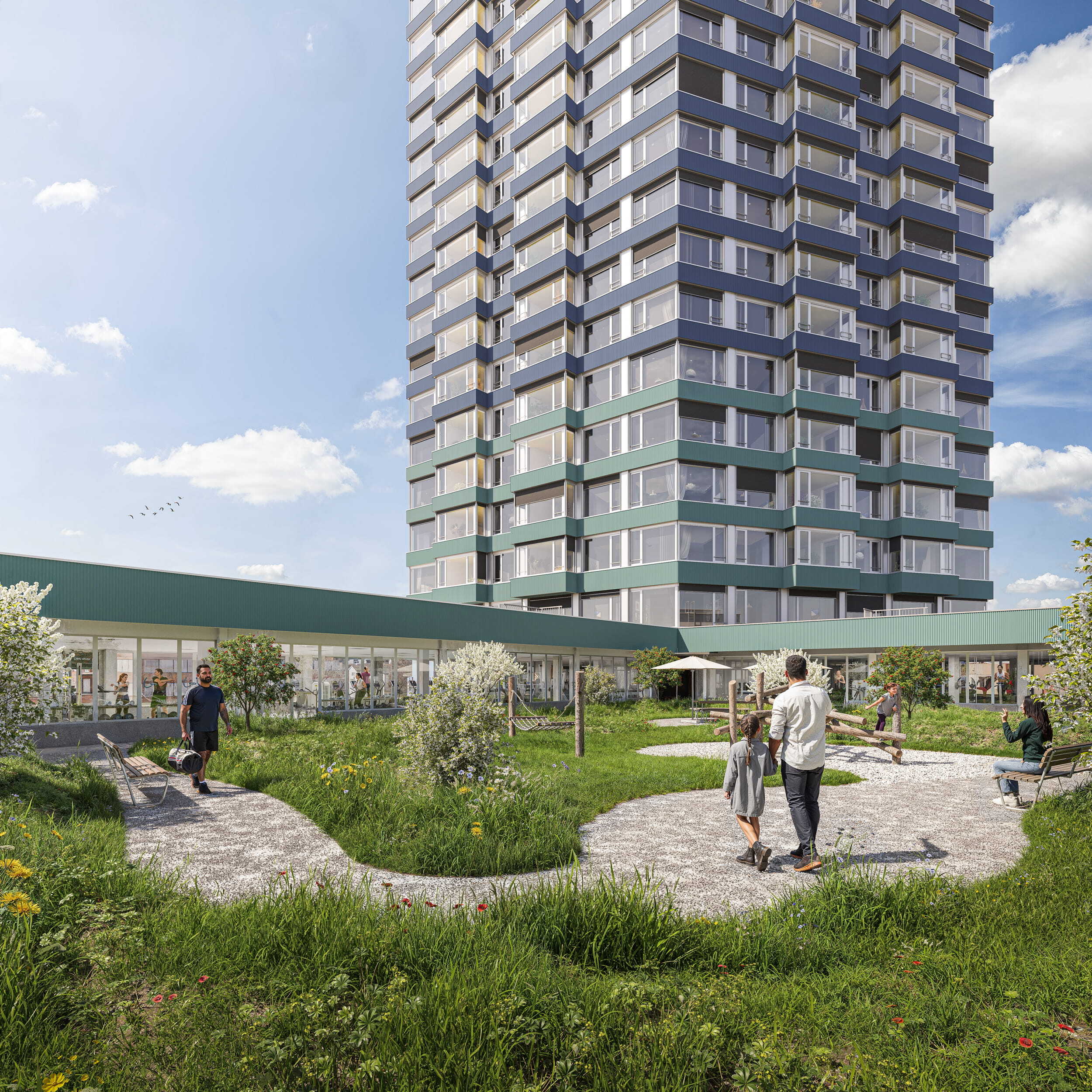 With retail space, studios, modern offices and rental flats, the project brings living and working together in an ideal way. Short distances, urban comfort and private retreats complement each other to create a new centre for everyday life, work and leisure.