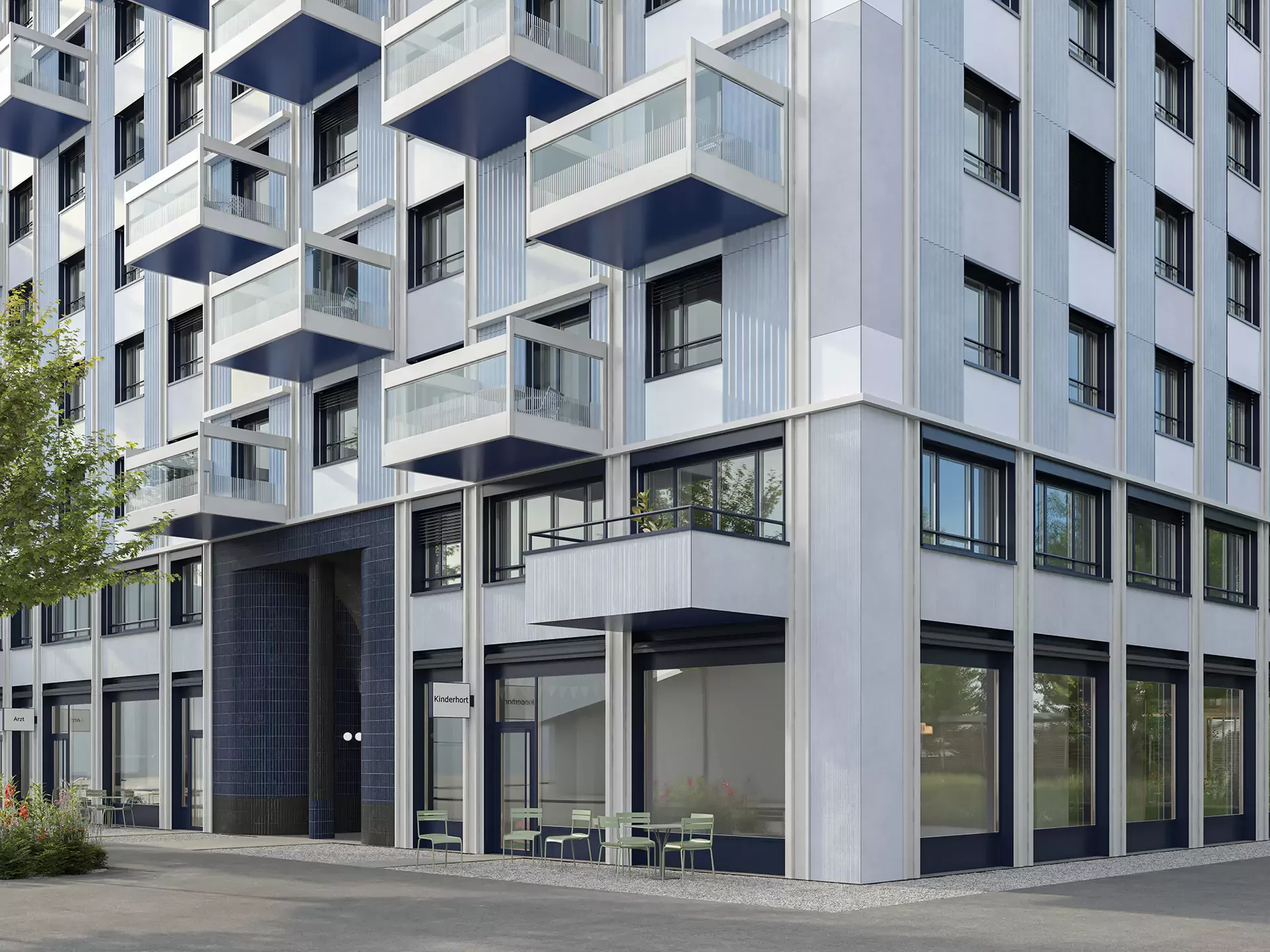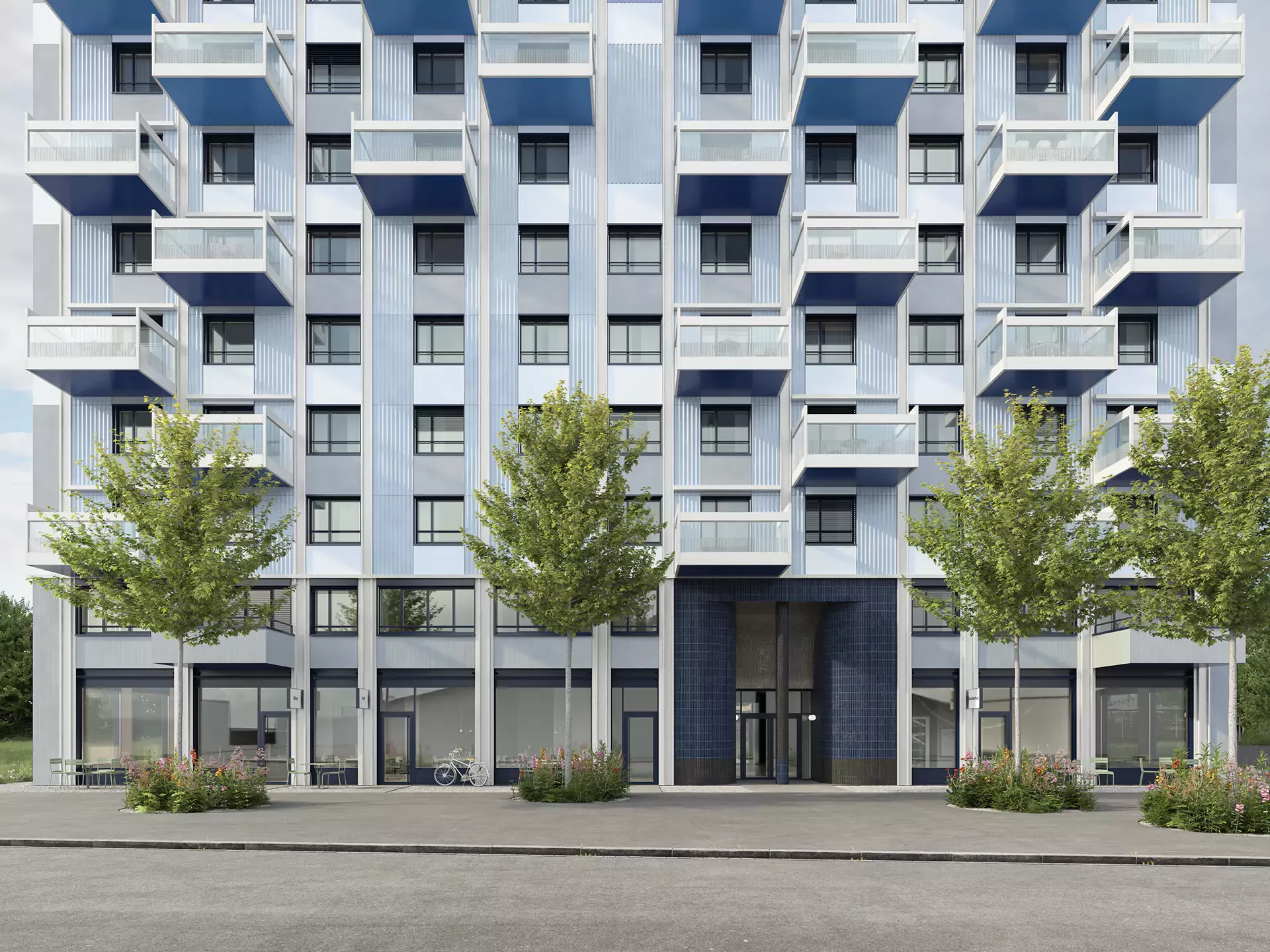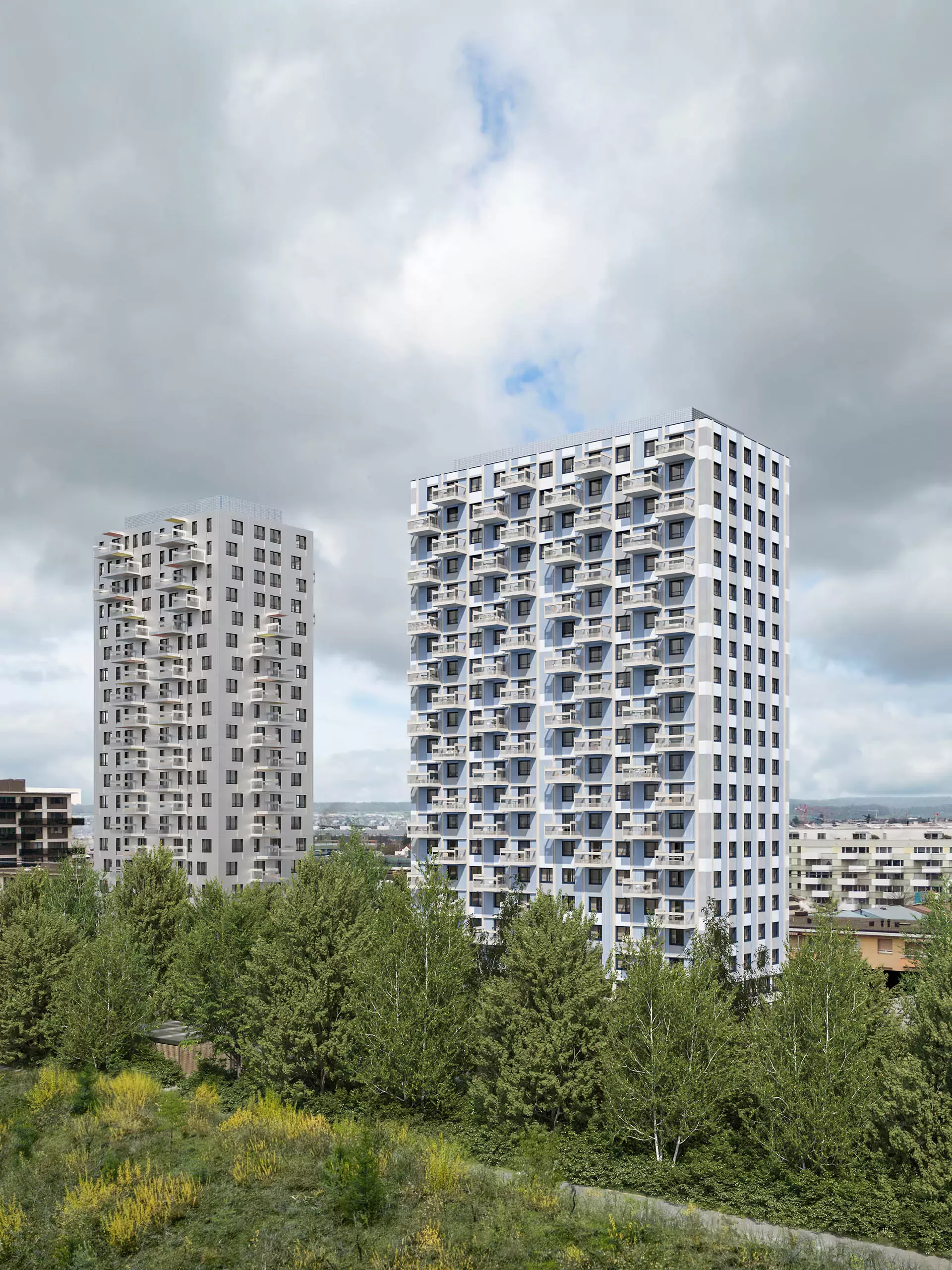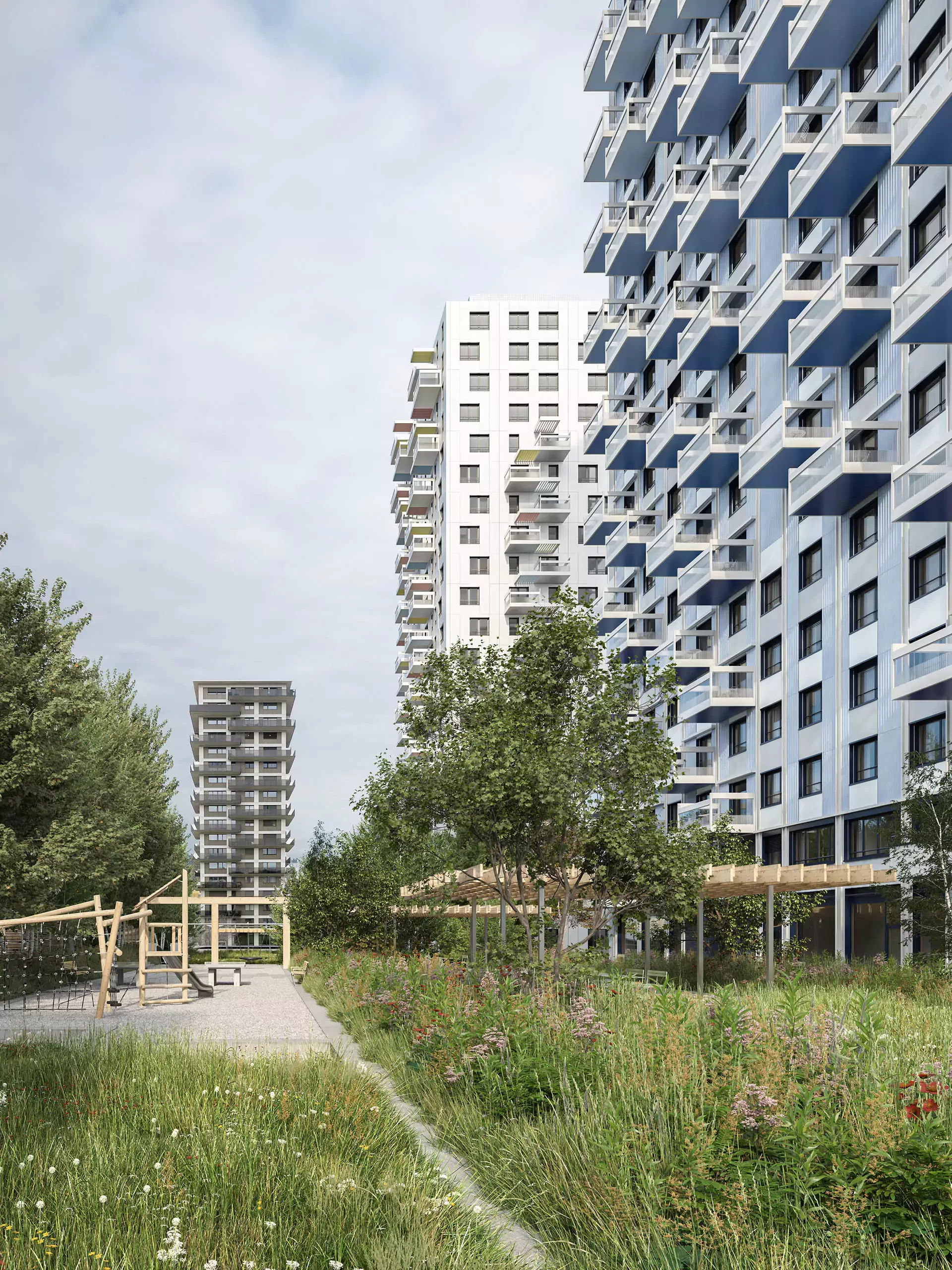 Im Herzen des neuen Hochhausprojekts erblüht ein prachtvoller Park, der geschickt in belebte und ruhige Zonen unterteilt ist. Pergolen laden hier zum Verweilen ein, bieten angenehmen Schatten und schützen vor neugierigen Blicken von oben. Die Fassade des Hochhauses selbst ist eine Hommage an das Thema «Weben und Verweben». Sie kombiniert vertikale Strukturen mit horizontalen Elementen, die sich elegant miteinander verflechten. Der Eingangsbereich sticht durch seine ausgefallene Materialwahl und die zweigeschossige Architektur hervor, wodurch das Foyer zu einem einladenden Ort des Verweilens wird. Die Wohnungen im Hochhaus bieten vor allem für Familien ideale Lebensräume. Besonders die Familienwohnungen in den unteren Etagen profitieren von einem direkten Zugang zum grosszügigen Aussenbereich, was das Wohnen in der Stadt mit einem Hauch von Natur verbindet.